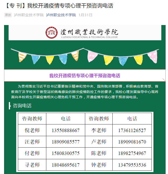 人文学院教师寻芒芒积极参与泸州市未成年人心理成长中心的心理防疫工作,关于心理专业辅导的推文发布在团市委的“泸州青年”官方公众号;在疫情期间积极参与成长中心热线12355的接听工作,针对疫情的心理调适给予指导,对疫情传播的担忧进行恰当解答;积极参加清华大学和幸福公益组织的“抗击疫情 心理援助”热线接听工作,为社会大众在疫情期间的心理调适贡献力量。