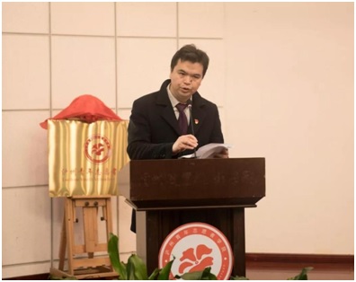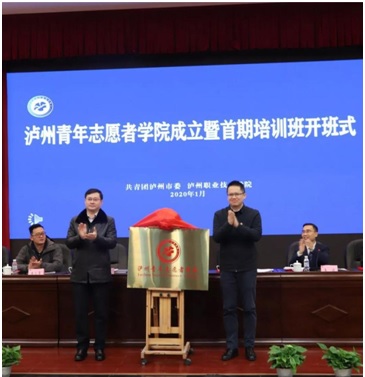 王波宣读泸州青年志愿者学院成立文件,唐经天、何杰一起为泸州青年志愿者学院揭牌。