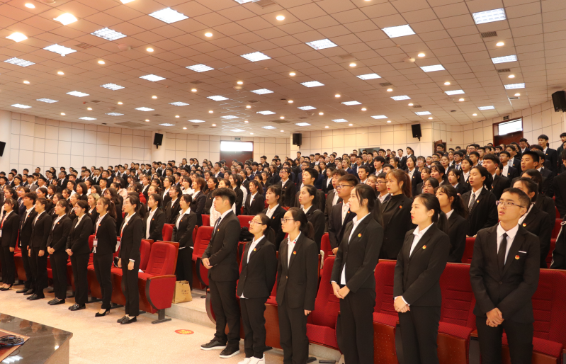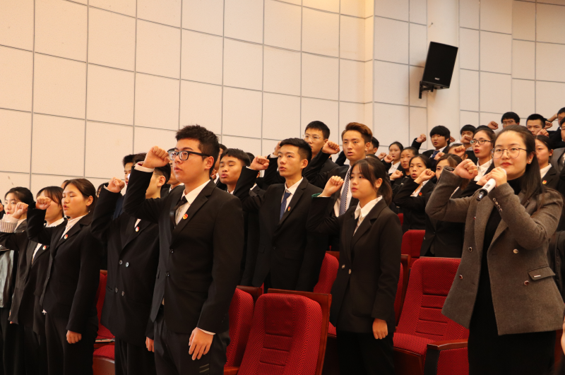 为加强我校共青团队伍建设,充实和壮大共青团组织力量,不断提升组织战斗力,提高大学生政治意识和政治站位,纪念庆祝中国共青团成立97周年和一二·九抗日救亡运动84周年,弘扬“爱国、进步、民主、科学”的爱国主义精神,凝聚青春力量,奉献青春智慧,学校于2019年12月6日下午在求实厅隆重举行了2019年新团员入团仪式。共青团泸州市委副书记石惠、组织部部长何源,学校党委委员邓安容、团委副书记邹烨燔、人文学院团总支书记穆小平、艺术传媒学院团总支书记高驰、电子工程学院团总支书记徐月梅,各二级学院教师代表、老团员代表和2019级全体新团员参加仪式。仪式由团委书记付波主持。