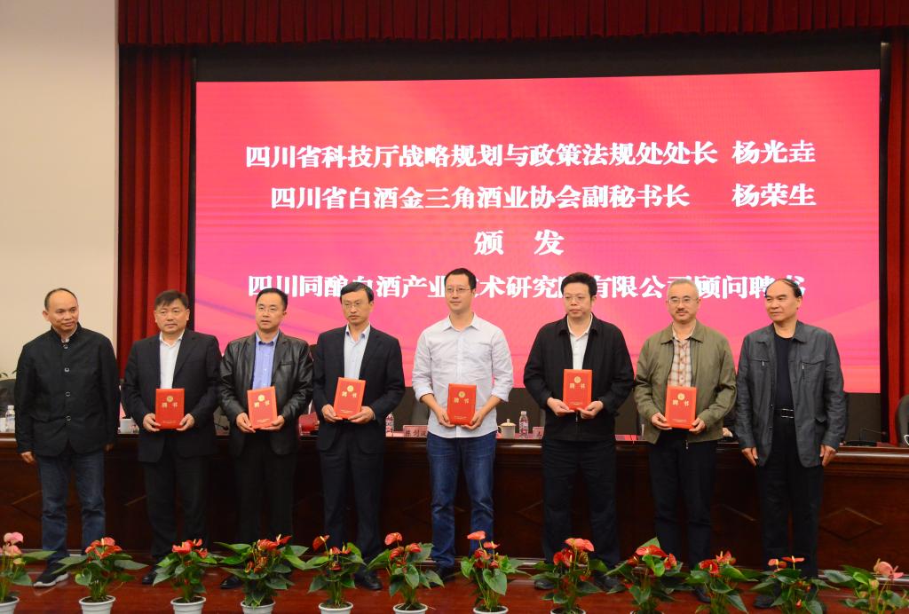 杨光垚、杨荣生共同向四川同酿白酒产业技术研究院有限公司聘任的6位技术顾问颁发了聘书。
