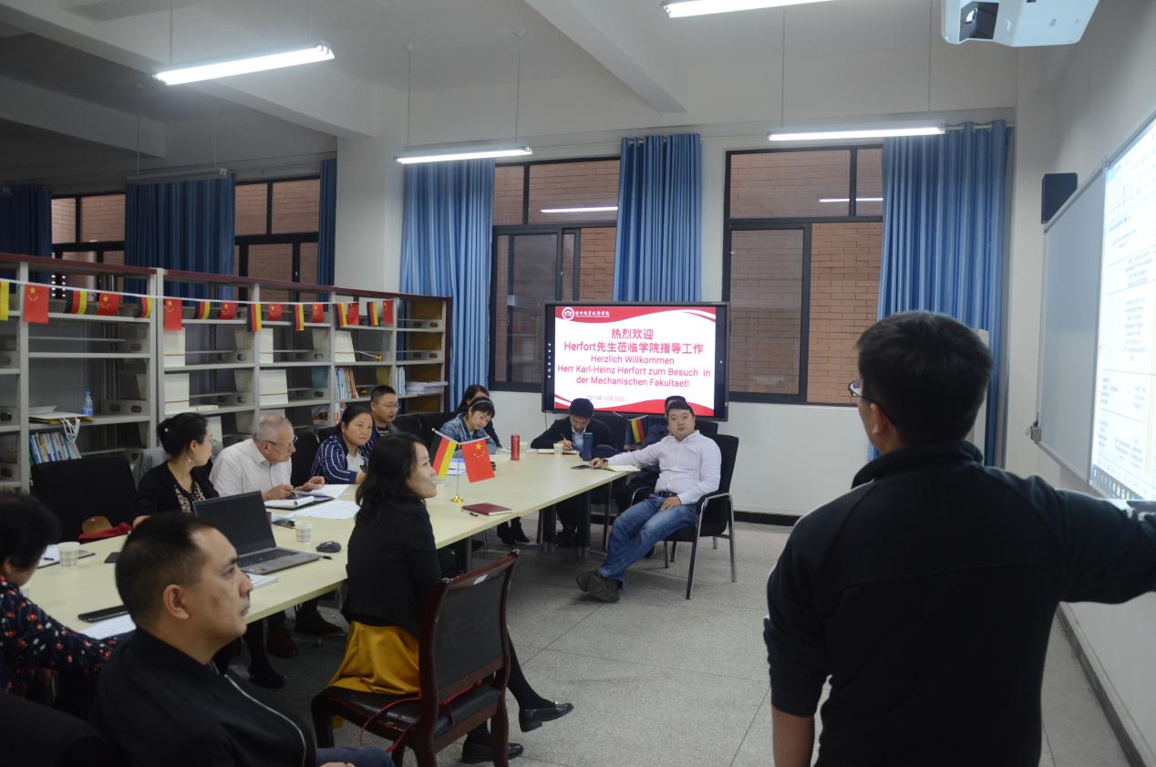 10月19日上午,赫福特听取了机械工程学院院长助理李刚对中德合作项目实施情况的汇报,充分肯定了我校在中德合作项目上作出的成绩,并视察了机械工程学院教学场所及实训设施情况。