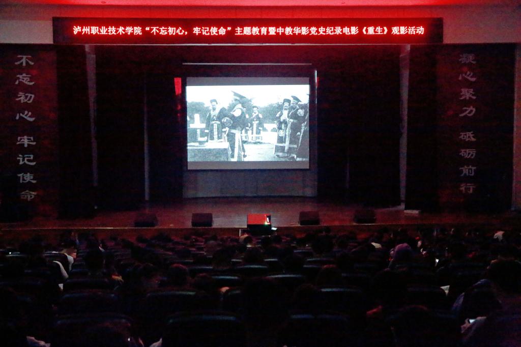 为了深入开展“不忘初心、牢记使命”主题教育,切实加强学校思想政治工作和文化育人工作,根据习近平总书记对认真学习党史作出的重要指示精神,按照中央、省委、市委主题教育领导小组安排部署,结合《中共中央宣传部等印发〈关于广泛开展校园文化活动的工作方案〉的通知》要求,2019年10月15日,我校党委在玉阶素质教育中心召开了中心组学习扩大会议,即“不忘初心、牢记使命”主题教育党史记录电影《重生》观影活动。党委班子成员、中层干部、学生代表等近700人观看了影片。