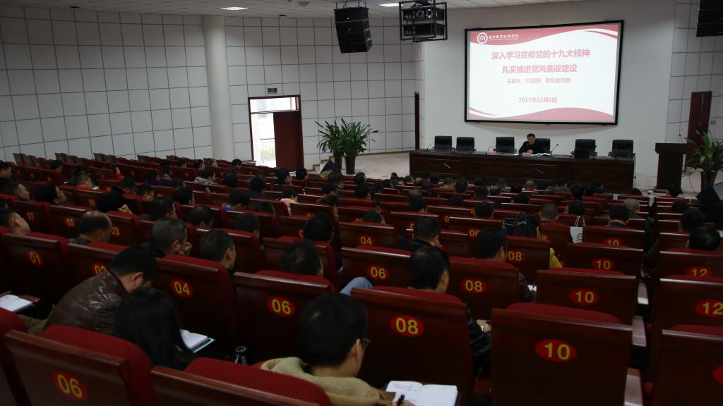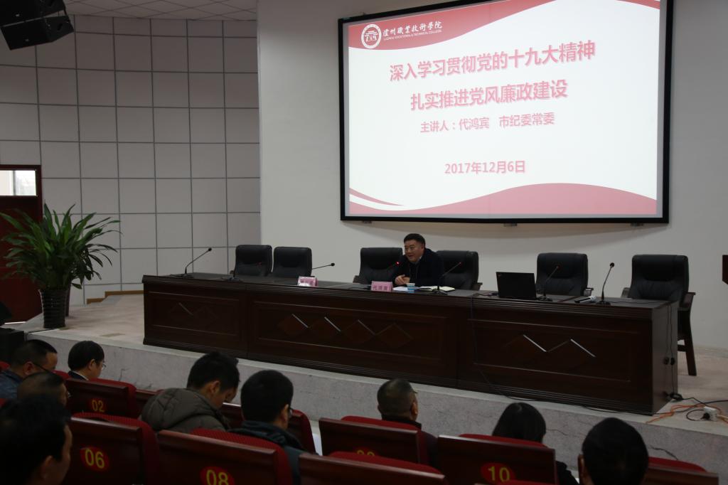 本站讯(信息来源:纪检监察处、宣传统战部)2017年12月6日下午,泸州市纪委常委代鸿宾在学院求实厅为学院党委中心组全体成员暨学院举办泸州市第16期中学校长任职资格培训班学员作党风廉政建设专题报告。代鸿宾常委强调,要深入学习贯彻党的十大九精神,落实全面从严治党要求,扎实推进党风廉政建设,切实构筑不想腐的堤坝,增强廉洁自律和拒腐防变的能力。学院院长贺元成主持报告会。