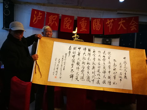 各片区庆祝大会上,组织了独唱、小合唱、诗朗诵、向学院赠送书法作品、游园活动等,一首首耳熟能详的经典歌曲,用深情的嗓音将在场听众带回激情燃烧的岁月,引起了现场观众的强烈共鸣;展现了泸职院退休教师昂扬向上的精神风貌,也饱含激情地表达了退休人员对学院、对党、对祖国发展的满腔热诚。