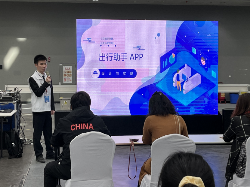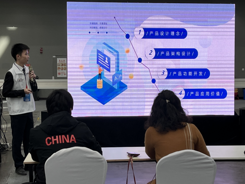我校学子黄镇洪在教师华卫指导下,以APP、视频和PPT的形式呈现赛前自己设计开发的作品,以路演的方式陈述自己作品的设计理念和实现思路,并参与答辩互动环节,最终以第一名的成绩斩获该赛项的一等奖。