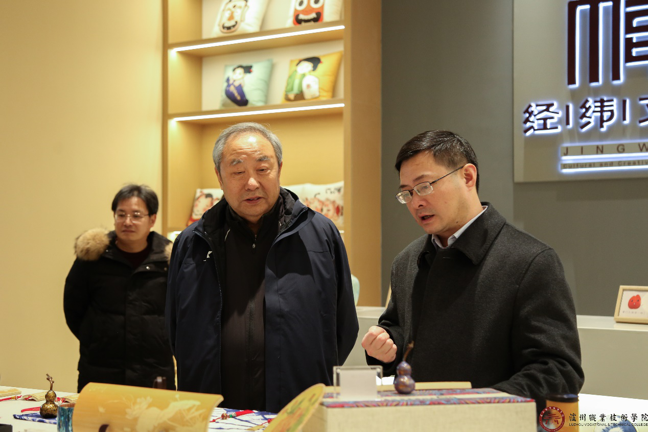 在经纬文创区,何杰介绍了我校以非物质文化遗产油纸伞与竹刻为主题制作的文创产品,周和平对此非常关注,他希望我校能做好非物质文化遗产的保护与传承工作,以非物质文化遗产保护为起点,走好特色办学之路。
