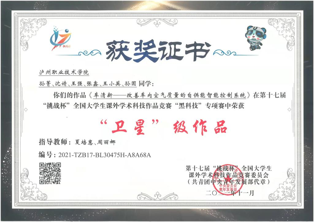 学生作品被评为十七届“挑战杯”全国大学生课外学术科技作品竞赛“黑科技”专项赛“卫星”级作品
