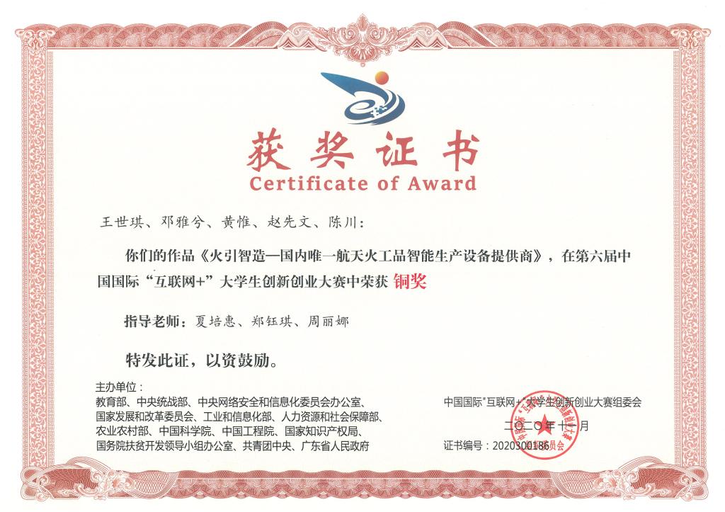 学生获2020年第六届中国国际互联网+大学生创新创业大赛国赛铜奖