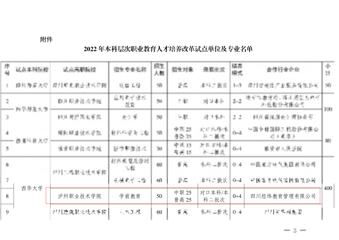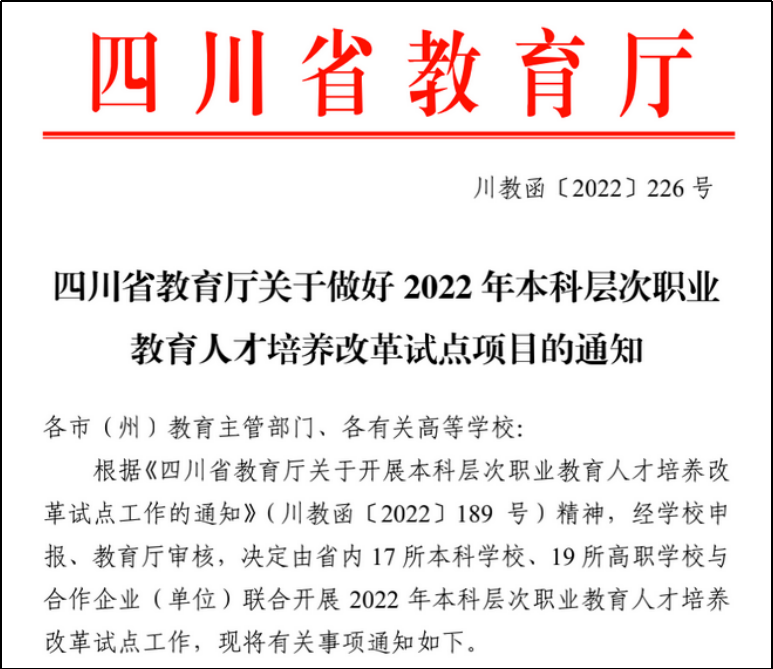 近日,根据《四川省教育厅关于开展本科层次职业教育人才培养改革试点工作的通知》(川教函〔2022〕226号),我校获批四川省2022年本科层次职业教育人才培养改革试点,与西华大学联合开展学前教育专业本科人才培养,2022年计划招生50人。