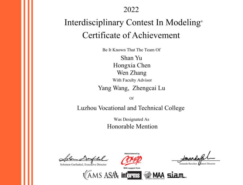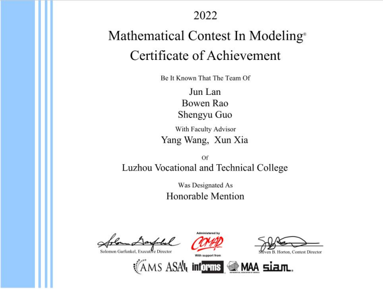 近日,2022年美国(国际)大学生数学建模竞赛(MCM/ICM)成绩揭晓,我校2020级软件技术专业兰俊、饶博文、呙生雨和2020级人工智能技术服务专业余珊、陈洪霞、张文喜获国际二等奖(Honorable Mention)2项,我校是四川省唯一获奖的高职院校。