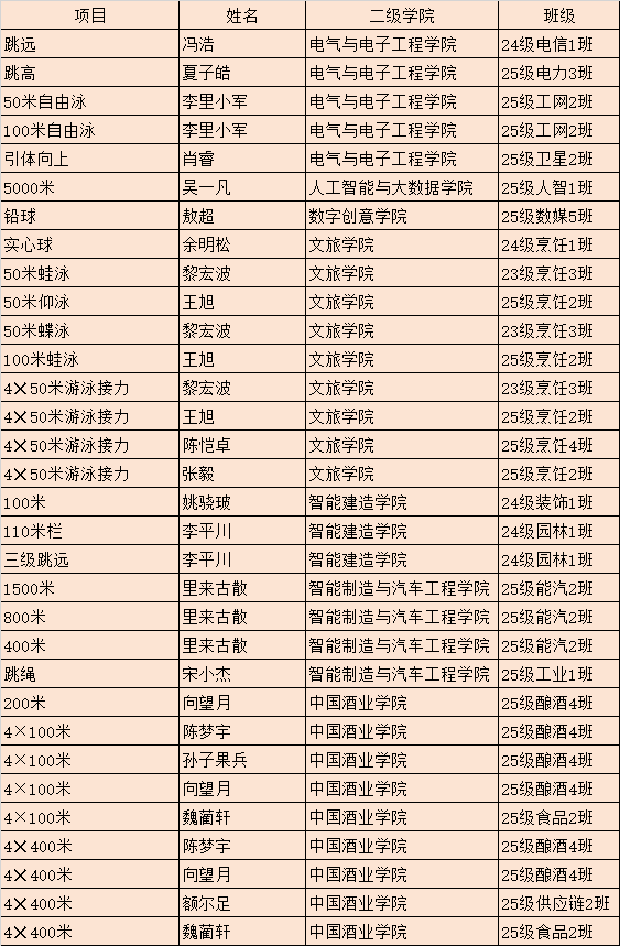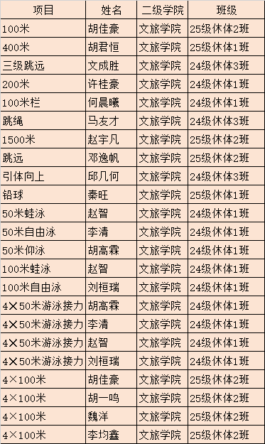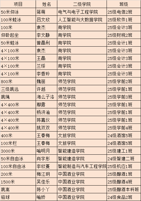校园男子组中,李平川斩获110米栏、三级跳远冠军并破纪录,里来古散包揽400米、800米、1500米三项冠军,李里小军、黎宏波、王旭等在游泳项目中摘金。校园女子组里,蒋萌50米仰泳、喻明月3000米均破纪录夺冠,王春梅、袁杰、魏丽等运动员表现亮眼。专业组文旅学院运动员肖韵佳、雷诗雨分别打破纪录,尽显专业竞技水平。